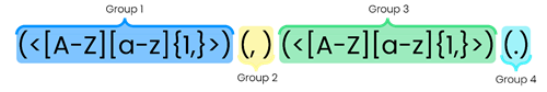 In other words, you want to find a name (i.e., a word that is a capital letter followed by arbitrarily many lower-case letters), a comma and a space, another name, and a period, and you want to change it to the second name, a space, and the first name, and that’s all. What you do is put them in four minivans and swap the order of the two minivans that contain names, and drive the other two off a cliff leave out the other two. So you start by finding these four groups—using the parentheses to group them: