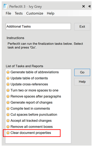 The document inspector in MS Word will delete this information for you. But it’s easy to forget. PerfectIt helps by reminding you to clear document properties at the end of your review. By selecting “Clear document properties” in Additional Tasks, PerfectIt will remove some document information, such as editing time and authors. Then it will prompt you to run the Document Inspector to do a full sweep for metadata—if you’re sending your document outside of your office be sure not to skip this step!