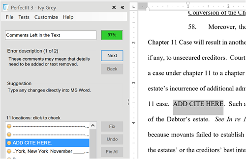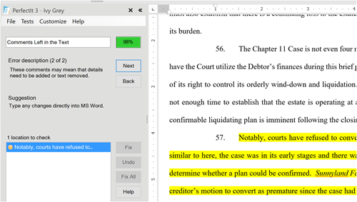 PerfectIt will also find certain key words that indicate that text is a comment not meant to be included in the final draft. Lawyers frequently leave in comments about citations or weight of authority.