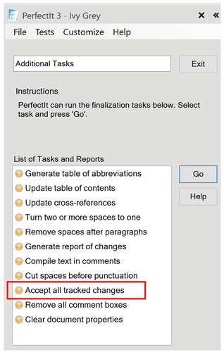 PerfectIt helps by reminding you to check all tracked changes at the end of your review. You can do this by clicking a single button in the Additional Tasks pane.
