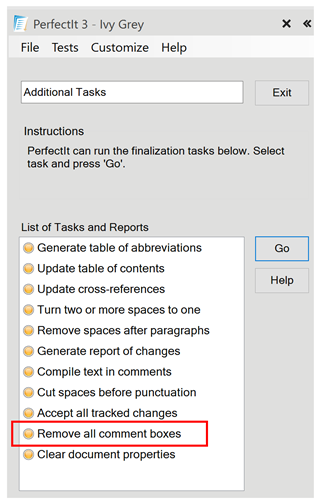 PerfectIt helps by reminding you to clear all comments at the end of your review. Like tracked changes, you can simply click a single button in the Additional Tasks pane.